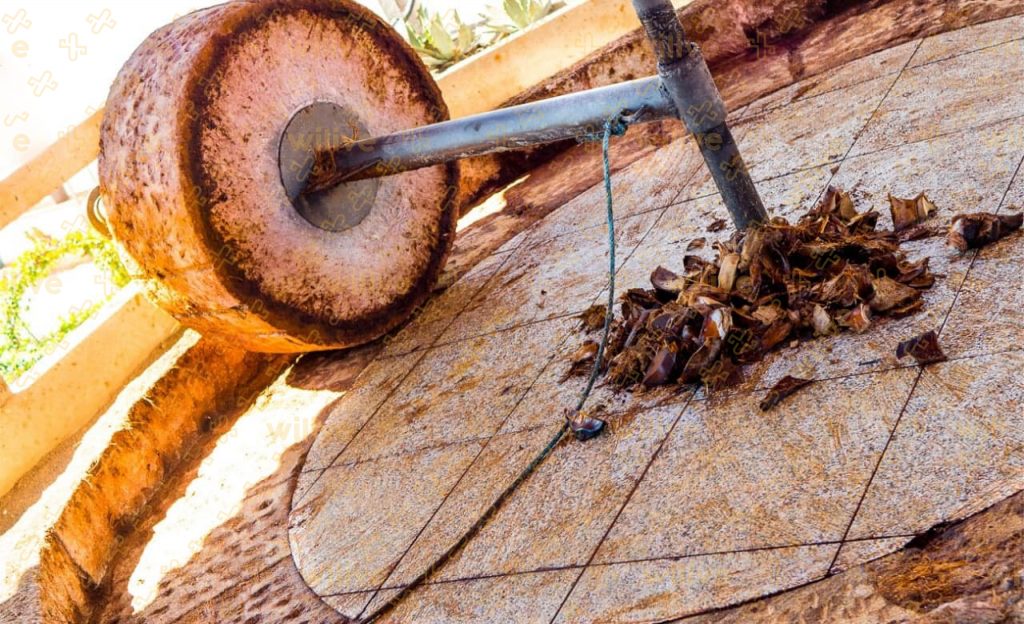 El mezcal es historia viva y con el transcurrir del tiempo se va añadiendo utensilios prácticos. Con la llegada de los españoles en 1521 se abrió una brecha de aculturación y sincretismo, añadiendo un molino de piedra en forma de rueda que va aplastando/moliendo los trozos de la piña ya cocidos; esta piedra pesa aproximadamente 500 kilos y es tirada por un animal de carga, se le denomina trapiche o molino de Tahona Chilena.